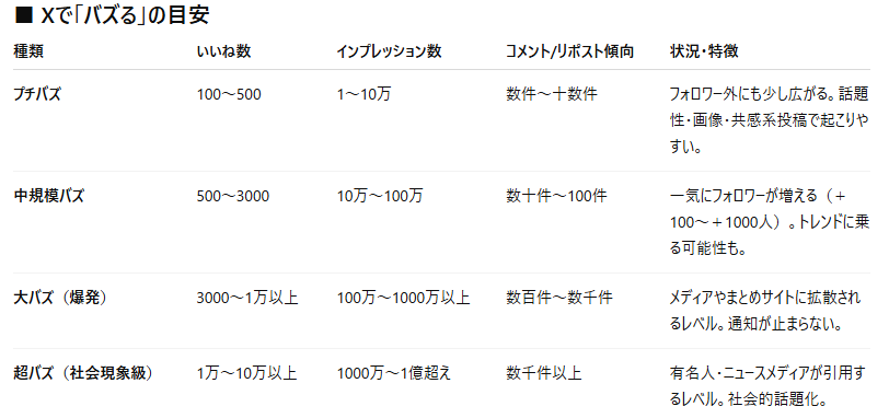いいね、インプレッションが1万越えるとプチバズと判定して良いとのこと。